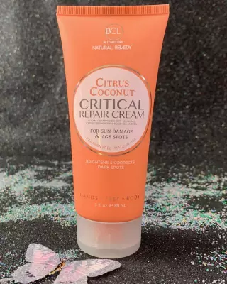 BCL NATURAL REMEDY Citrus & Coconut Critical Repair Cream for sun damage & age spots brightens and corrects hyperpigmentation with Certified Organic Citrus and Coconut. Infused with Certified Organic Carrot Seed Oil, this cream promotes natural UV protection for hands, feet and body while repairing critically dry, cracked and callused skin.