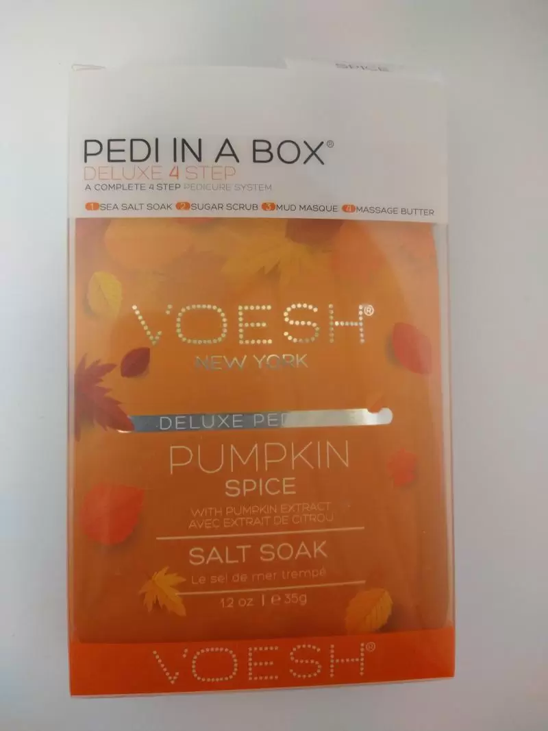 Voesh Deluxe Pedicure in a Box 4 in 1 -Sea Soak, Sugar Scrub, Mud Masque, Massage Butter - Pumpkin Spice individual spa pedicure collection is a four-step treatment that enriches skin with key ingredients to give feet much needed nutrients. Each set is individually packed with the right amount of product for a single pedicure, ensuring a clean and hygienic spa pedicure solution. Each set includes a Sea Soak, Sugar Scrub, Mud Masque, Massage Butter system.